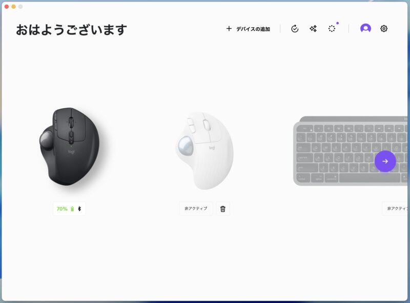 ジェスチャーを設定するには、まず Logi Options+ を起動して、設定したいマウスを選びます。例として、MX Ergo Sのミドルボタンにジェスチャーを設定してみましょう。