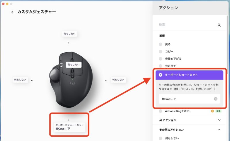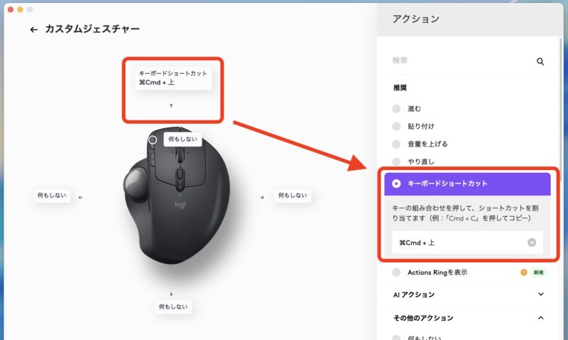 例えば、ボールを上に回すとページの先頭へ、下に回すとページの末尾へといった設定だと、直感的に操作ができて覚えやすいです - 右手を使うショートカットをジェスチャーに割り当てる