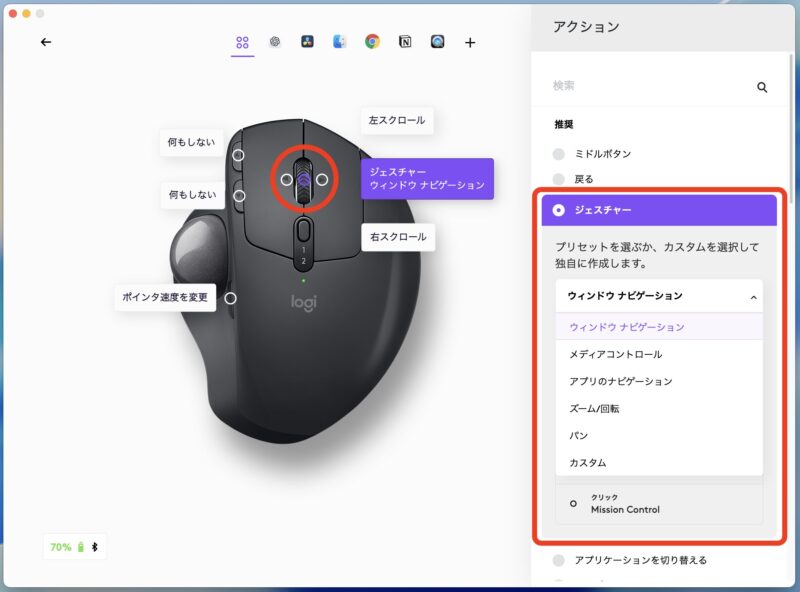 Logi Options+の画面でミドルボタンを選ぶと、右側にアクションの項目が表示されるので、「ジェスチャー」を選択すれば設定画面に移ります。